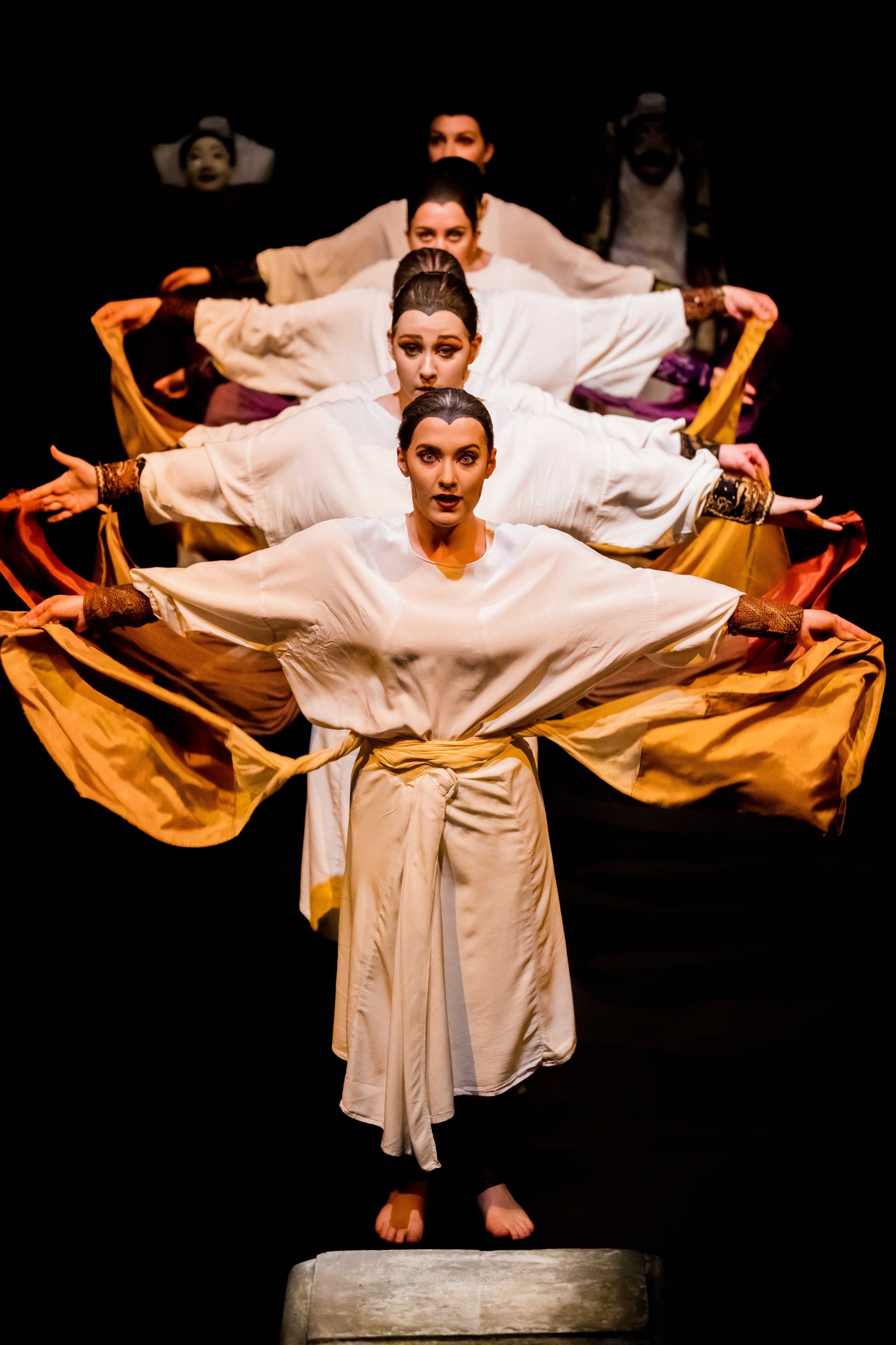 Our adaptation of Euripides’ Hippolytos is about reasserting the centrality of the ancient tragic chorus. To this end, all speaking parts have been removed; a narrator briefly recounts the unfolding of the plot at intervals; and the characters in the drama emerge mutely to act out their roles in mime and dance. All that remains intact of Euripides’ play is the lyrics of the choral set-pieces, performed in the original Greek, and some essentials of the plot. The challenge has been to demonstrate that, by working even within these parameters, it is possible to create a dramatic performance which is (for all the liberties we have taken) somehow truer to the spirit of ancient theatre than the bleak verbal dramas we have come to accept as the norm on the modern stage.